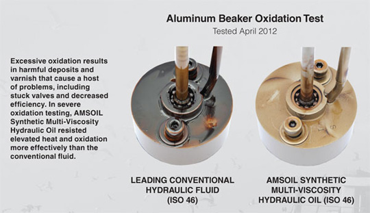 Increased heat can cause varnish to form on metal surfaces, including valves, pumps and bearings. Its soft, sticky composition ultimately hardens into a harmful veneer that can reduce fluid flow, plug filters, stick valves and increase friction. Synthetic Multi-Viscosity Hydraulic Oil is fortified with anti-varnish additives that chemically react with the building blocks of varnish, inhibiting its formation. It helps hydraulic systems
